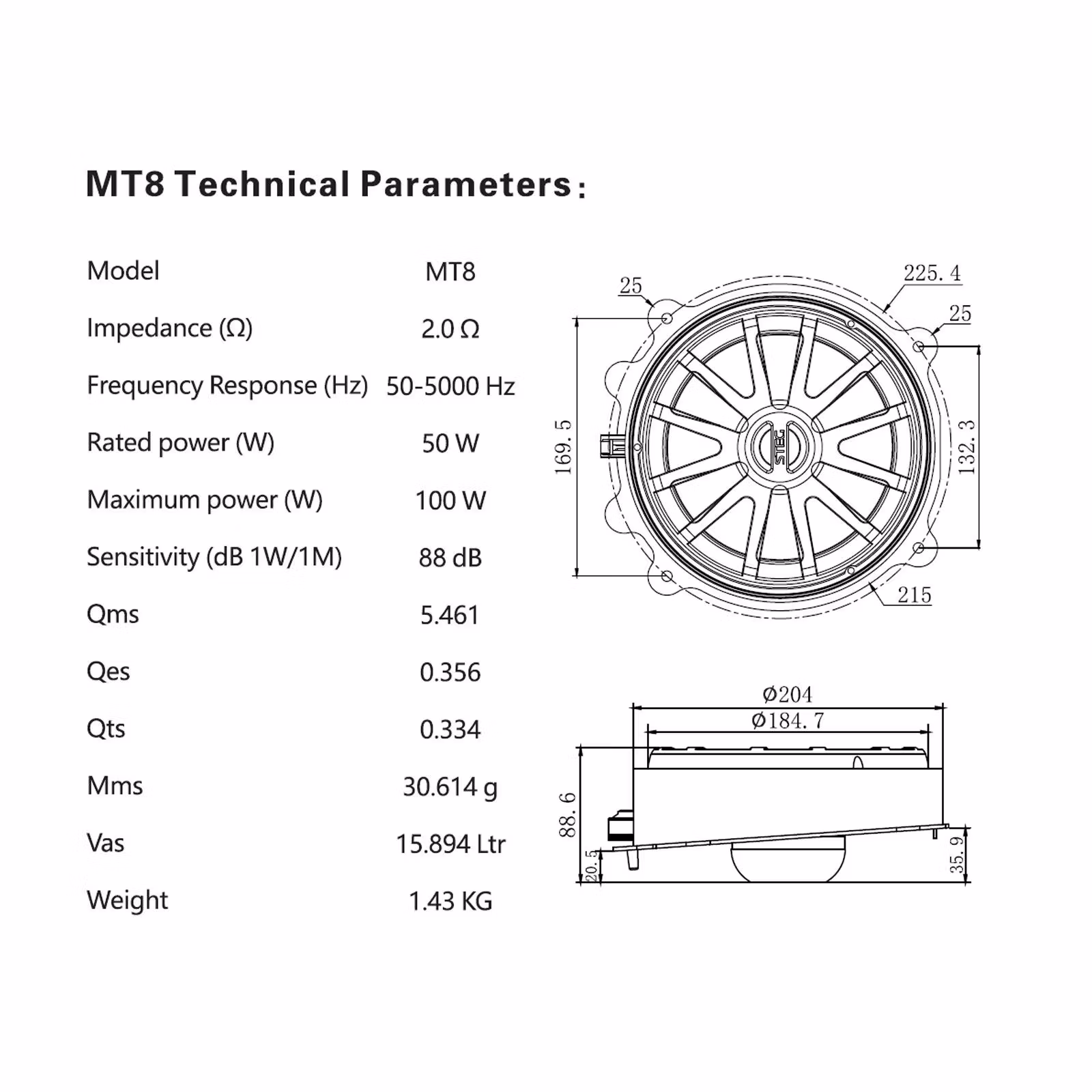 STEG MT 8 är 8″ basar som ersätter dina original-högtalare i framdörrarna, här får du en rejäl högtalare med riktigt vridstyv glasfiberkon och kraftfull neodymium magnet.